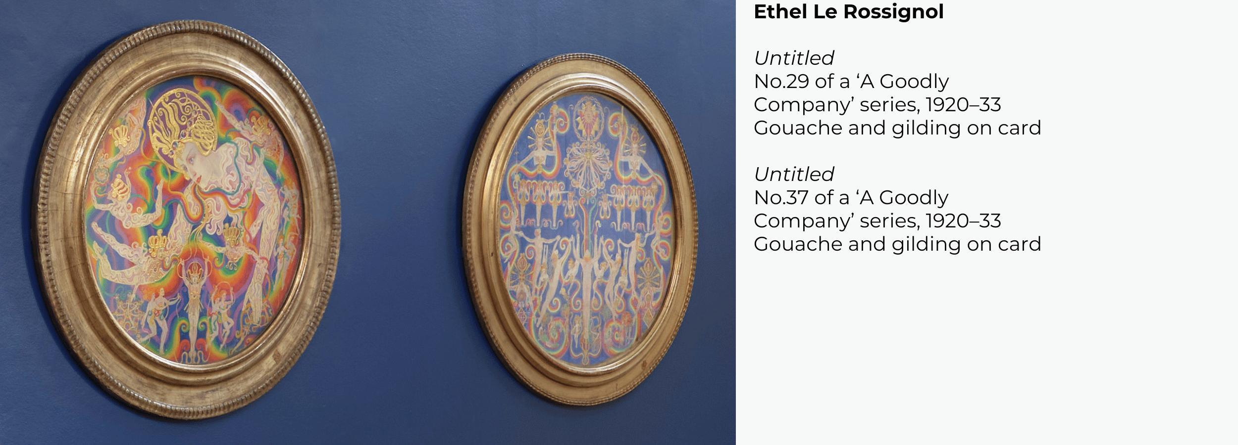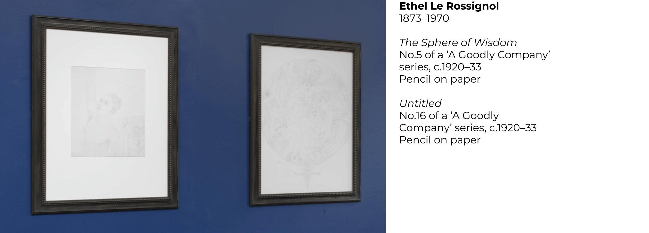 This selection of works by contemporary artists Ann Churchill, Victoria Rance, and Ariela Widzer is presented in dialogue with the visionary art of Ethel Le Rossignol. Together, they explore the boundaries between visible and invisible worlds, off ering visualisations of energetic forces, otherworldly beings, and the potential existence of unseen realms. The title A Goodly Company is drawn from Le Rossignol's self-published book of 1933, comprised of a series of psychic drawings and paintings accompanied by channelled written explanations. Conceived as an assurance of life aft er death, the book stands as a testament to the presence of spiritual forces beyond the material world.