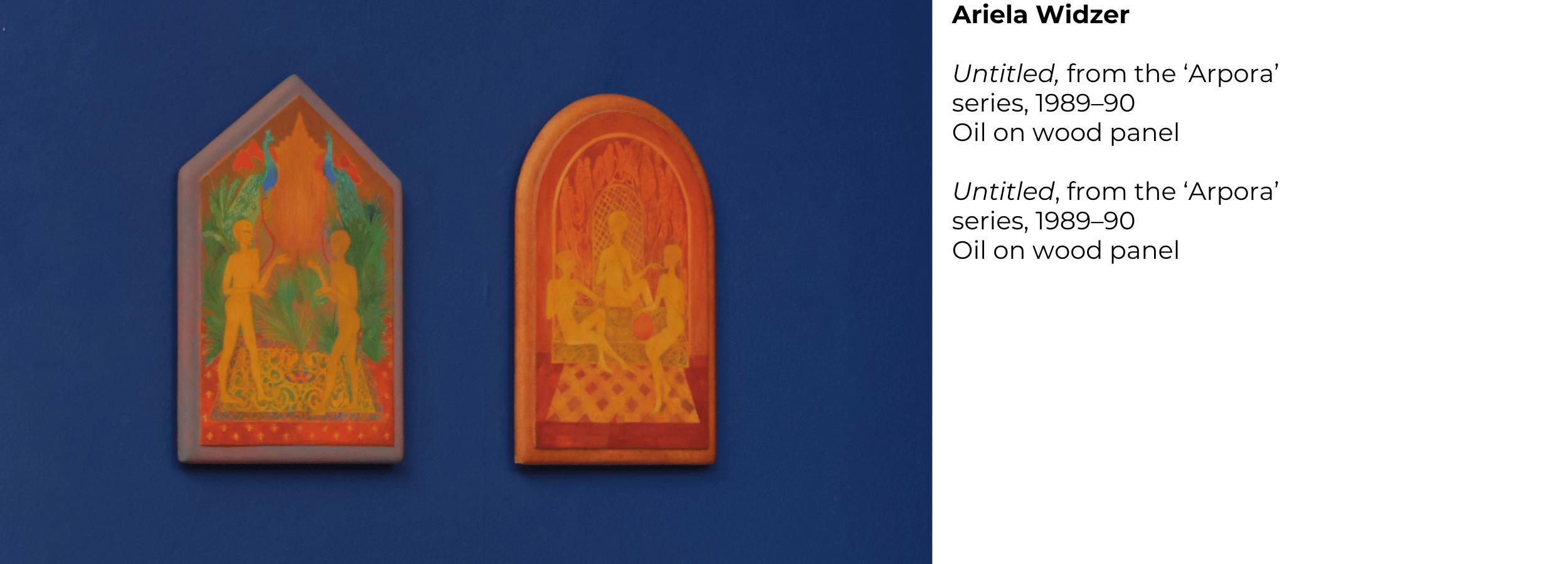 The works of Ariela Widzer explore esoteric ideas and the potential of unseen realities, spanning from early pieces in the 1970s to her current practice. These two panel works explore communication with unearthly beings, echoing the visionary art of Ethel Le Rossignol. Widzer's androgynous figures move through layered dimensions, appearing engaged in play within richly decorated, multi-patterned environments. In one, twin peacocks—symbols of enlightenment in Buddhism and immortality in Christianity—suggest spiritual transformation.