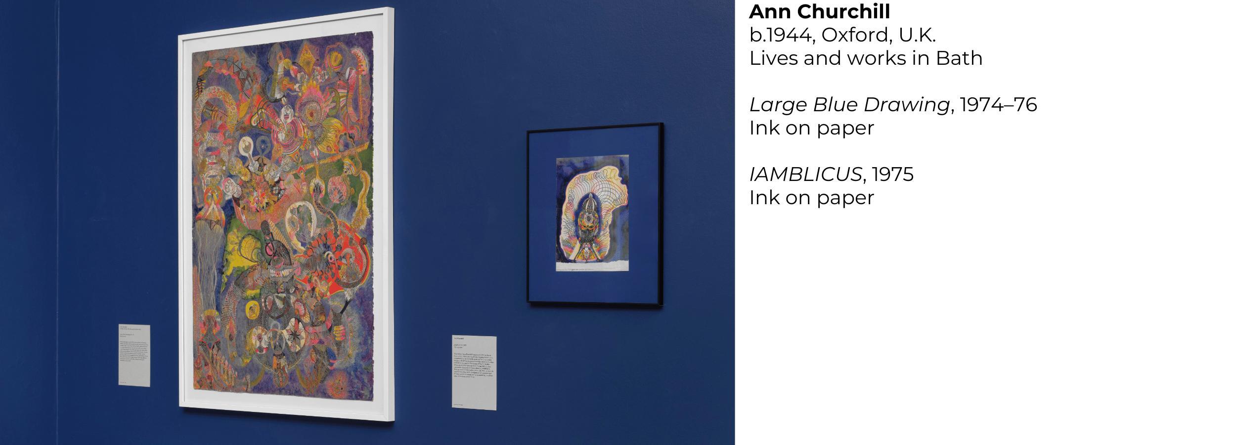 Created during the mid-1970s, the intricate ink Large Blue Drawing reflects Ann Churchill's deeply personal, meditative practice rooted in daily ritual. Since the late 1960s, daily meditation—to quiet the analytical mind and access the unconscious—has been central to her self-taught approach. Made while raising young children, often during brief moments of quiet, vibrant works such as this emerged intuitively, without planning. Filled with energetic, swirling, labyrinthine forms, they guide the eye from shape to shape, offering a glimpse into a quiet, interior world where life and making are intimately intertwined.