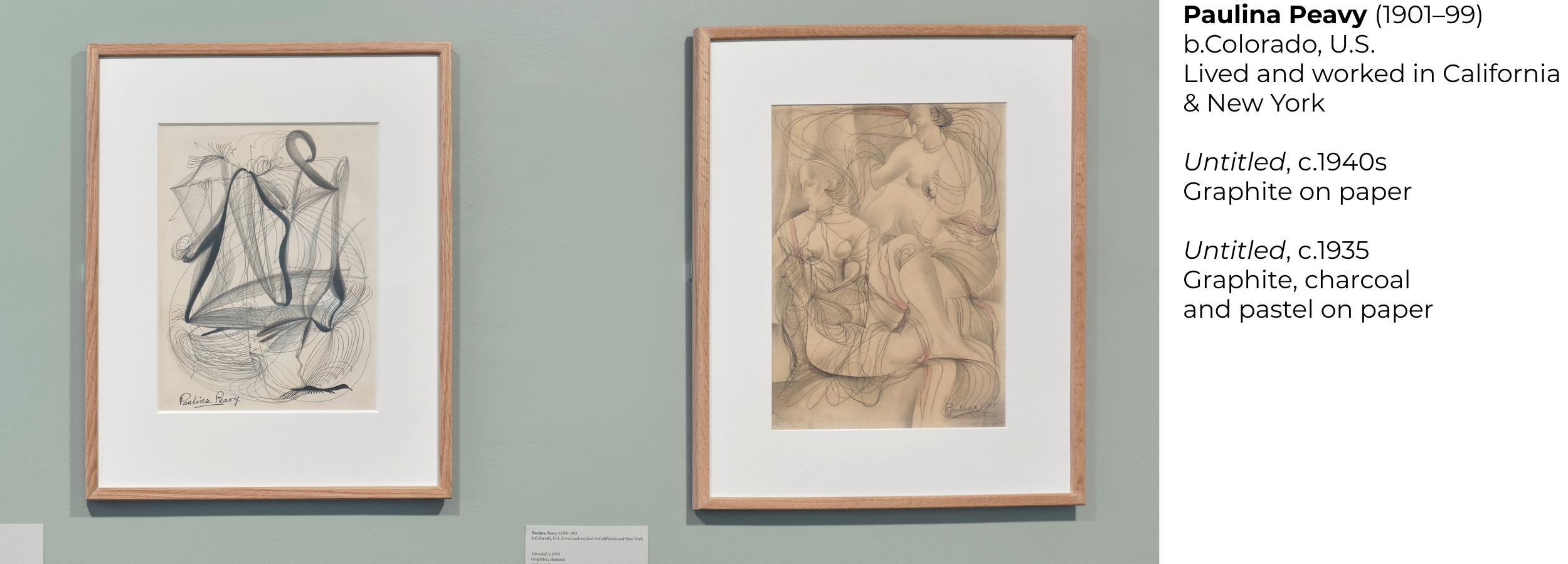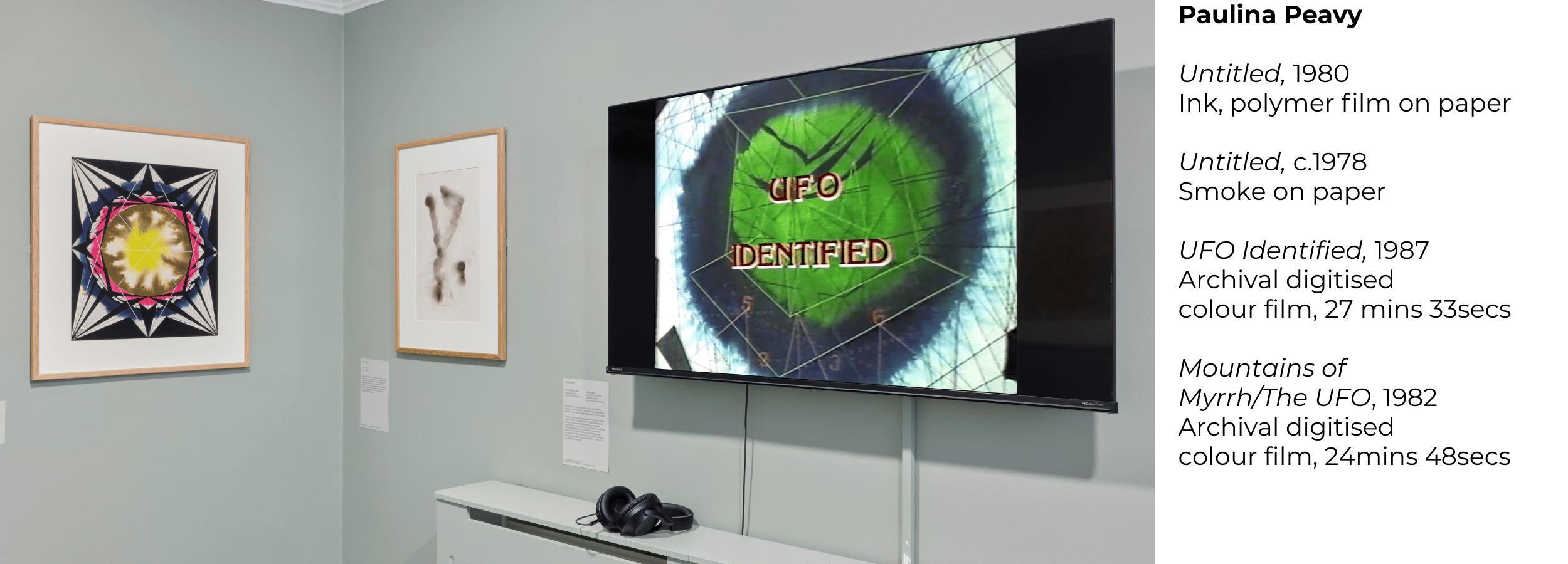 Paulina Peavy (1901–99) was a visionary artist, teacher, gallerist, and medium whose work was shaped by contact with a spirit entity named Lacamo—an extraterrestrial being she first encountered during a séance in the 1930s. Lacamo remained a lifelong collaborator, guiding Peavy's artistic process and spiritual worldview. Trained in Los Angeles, Peavy was active in early abstract and occultist art circles, exhibiting widely in the 1930s and 1940s. She later moved to New York, where she continued her multidisciplinary practice across painting, drawing, writing, and film. Peavy envisioned a utopian future brought about through the dissolution of gender, believing humanity would evolve toward an androgynous state of higher consciousness. The 'Paulina Peavy' room focused on her experimental works on paper and film, created as transmissions of her radical message.