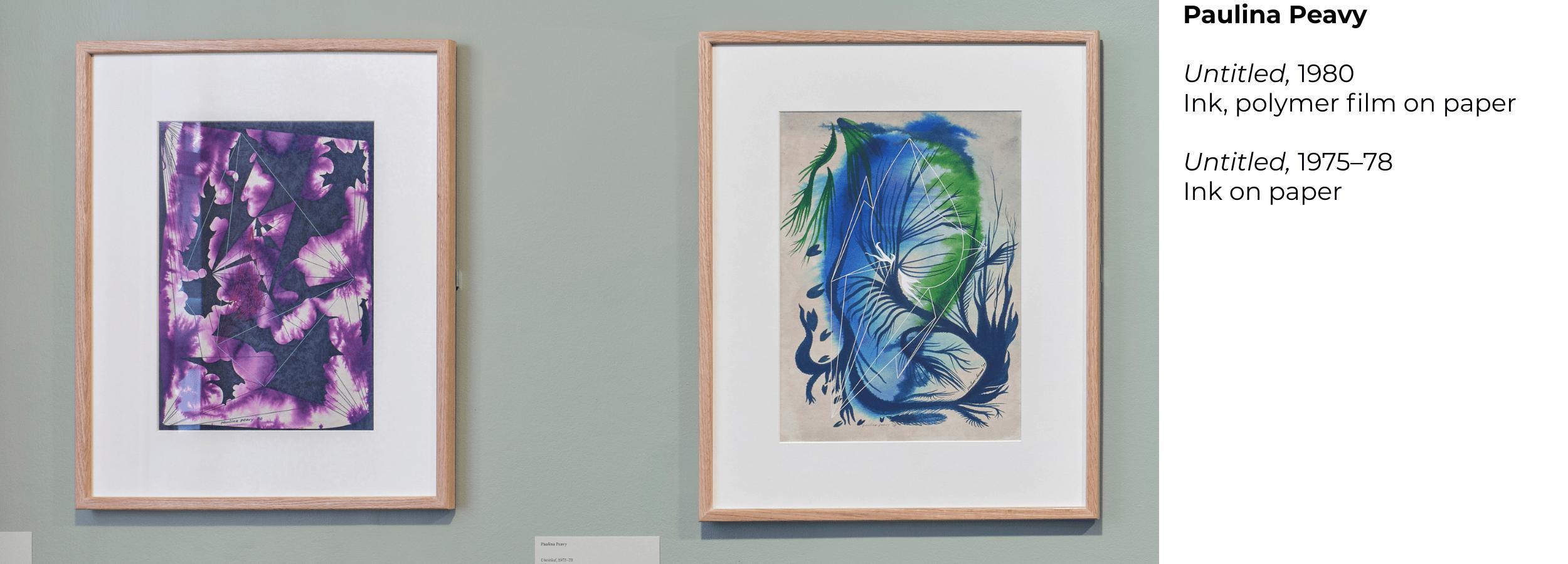 During the 1970s, Peavy created a series of works on paper that she referred to as 'Smokies' (above, centre). These were made by using the automatic technique fumage—where a sheet of paper is passed over a lit candle without conscious direction, capturing its smoky trails. Fumage was developed by artist Wolfgang Paalen (1905–59) in the mid-1930s and adopted by other Surrealist artists, including the British artist and occultist Ithell Colquhoun.